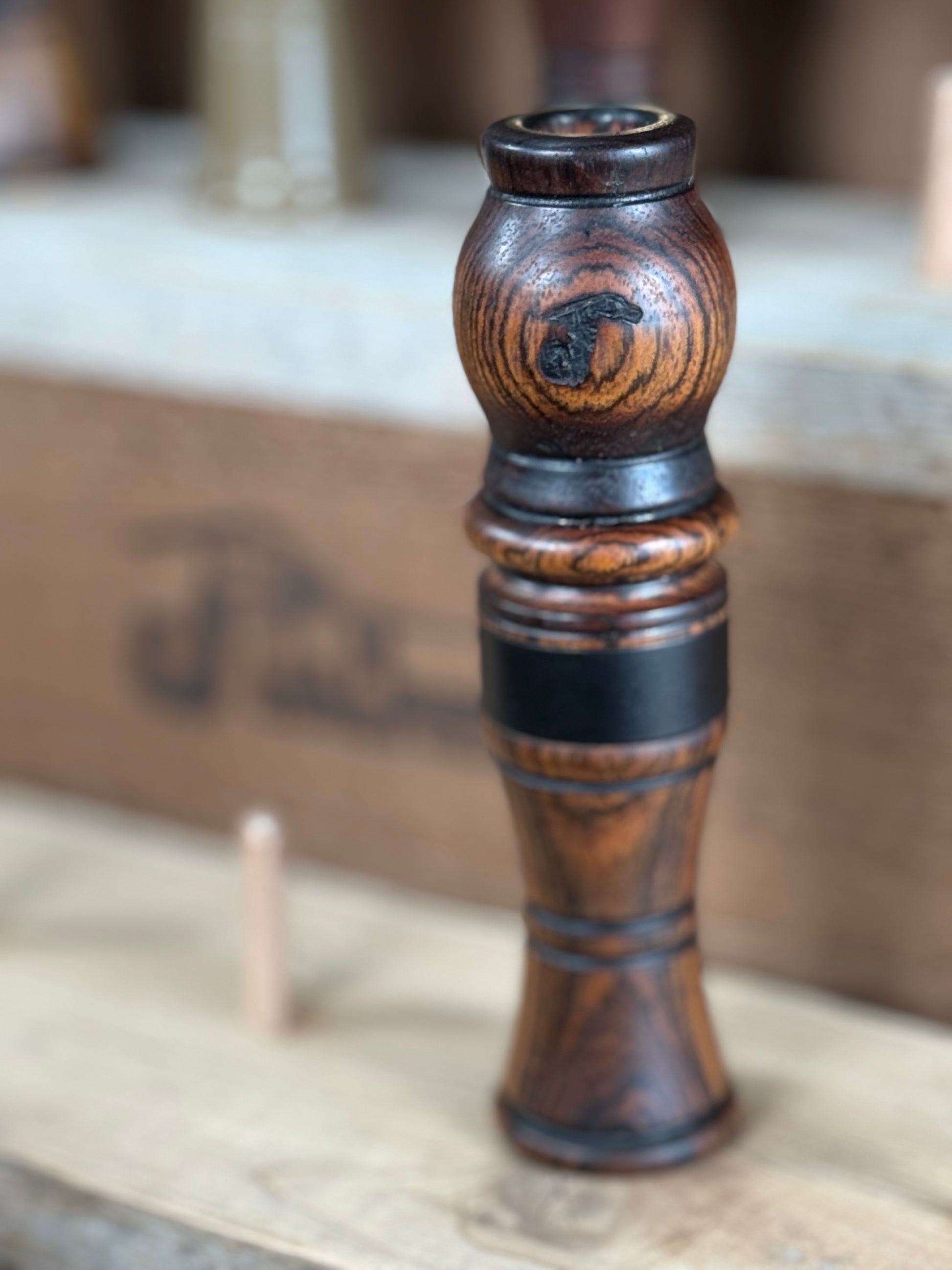 This is a Bocote big goose call. This call is tuned for those deep clucks and moans of a greater canada, and is tuned with worn in guts. Oil finished.